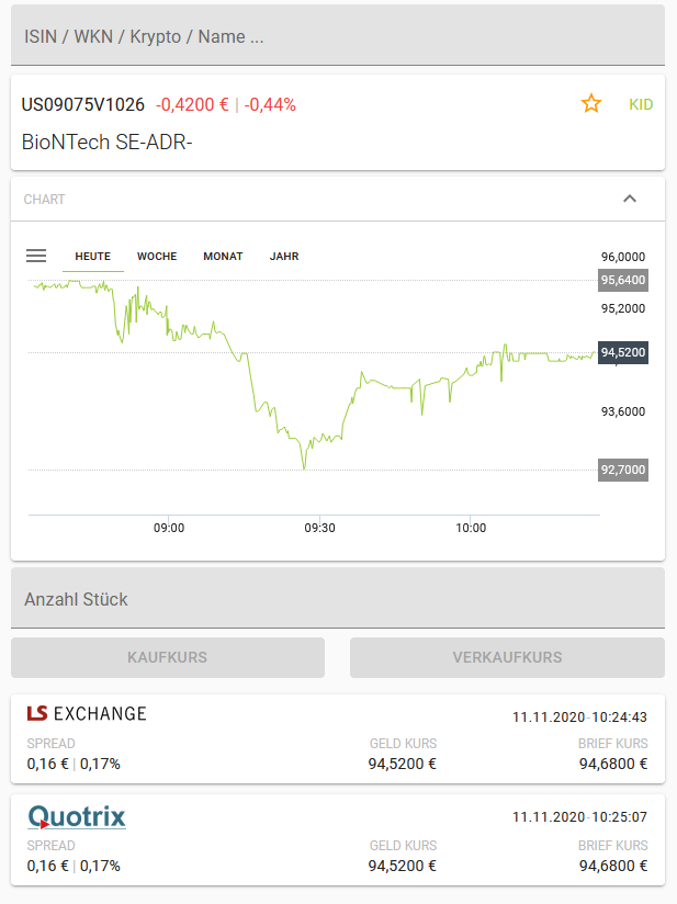 Sie können in der Ansicht zwischen Tages-, Wochen-, Monats- und Jahreschart wechseln und sich den jeweiligen Höchst- und Tiefststand ganz einfach mittels Klick auf das Grill-Menü im Chart anzeigen lassen. Je nach dem wo Sie das Chart aufrufen, stehen Ihnen unterschiedliche Chart-Optionen zur Verfügung. So können Sie bspw. im Orderbuch zusätzlich den Ausführungskurs mit anzeigen lassen und im Depot den durchschnittlichen Kaufkurs.