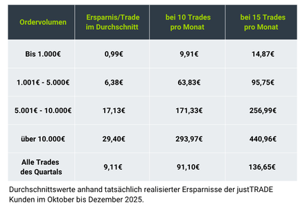Wir haben es bewiesen: justTRADE Kunden sparen im Schnitt 9€ pro Trade. Wie das geht? Durch die Auswahl an 3 Börsen. Schauen Sie sich direkt an, was Sie sparen können: Sparen dank Auswahl an Handelsplätzen