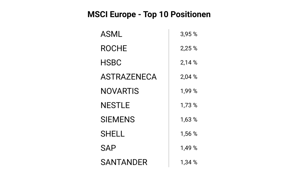 Abgesehen von minimalen Unterschieden in den Positionsgrößen sind die zehn größten Werte in beiden Indizes nahezu identisch. Angeführt wird die Rangliste von ASML. Zu den weiteren Top-10-Unternehmen zählen Novartis, Nestlé, AstraZeneca, Roche, Shell, SAP, HSBC, Siemens, Santander und LVMH Moët Hennessy. Alle zehn Positionen machen jeweils zwischen 1,4 und 3 Prozent des Index aus.