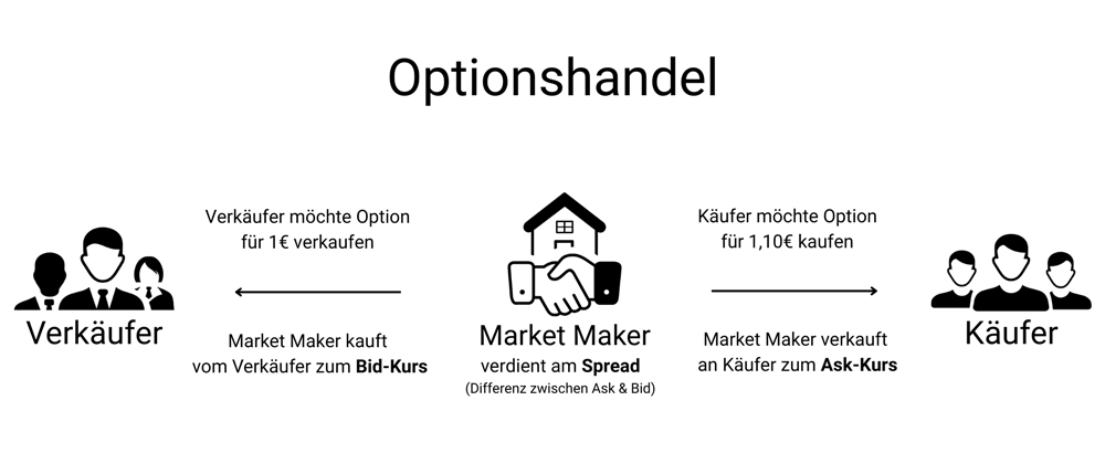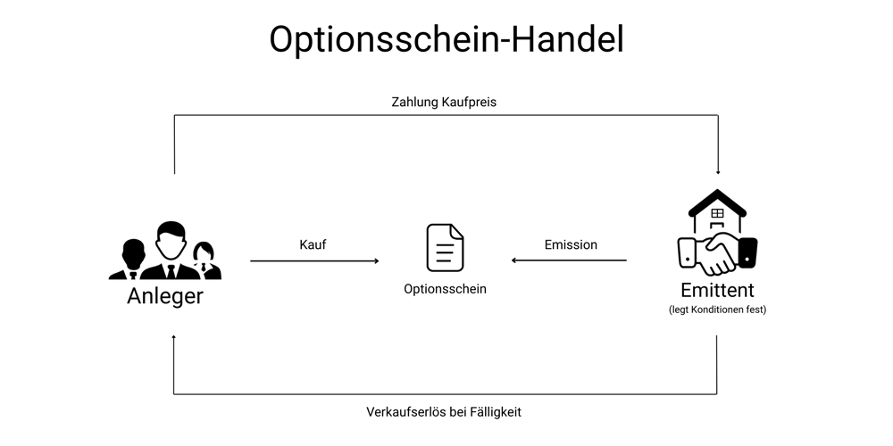 Optionsscheine werden im Regelfall von einer Bank emittiert, die somit auch die Rolle des Stillhalters übernimmt. Die Bank ist es außerdem, die für die Konditionen des Optionsscheins verantwortlich ist. Optionsscheine enthalten eine Wertpapierkennnummer, weil sie an einer Aktienbörse gehandelt werden. Möglich ist aber genauso der direkte Handel mit dem Emittenten. In diesem Fall stellt die Bank die An- und Verkaufspreise und tritt als Market Maker auf.